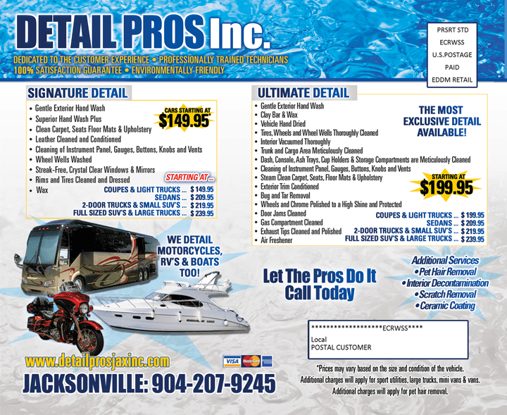 For the finest in Auto, Boat, RV, and Motorcycle detailing services, turn to Detail Pros Inc. We use only premium-quality products and equipment tested for reliability on your mode of transportation.